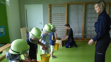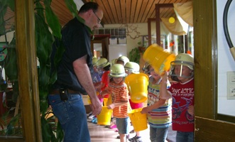 Bevor die Kinder kommen wird ein Tischkreis aufgebaut und für jedes Kind ein Becher mit Wasser und ein Porzellanteller mit Kerze bereitgestellt. Nach der Begrüßung durch den Kommandanten werden die Aufgaben der Feuerwehr hinterfragt und Beispiele besprochen. Im Gespräch wird dann auch auf das Löschen in vergangener Zeit, als es noch keine Schläuche gab, hingeführt bis das Stichwort „Bilden einer Eimerkette“ fällt. Die Kinder werden dann aufgefordert eine Eimerkette zu bilden. Die Kinder erhalten dazu einen Plastik-Feuerwehrhelm und Kindereimer ausgehändigt, wobei als Wasser eine Schachtel mit Als Styroporteilen dient. Irgendwann ist dann der „Brand“ gelöscht und die Kinder gehen wieder auf ihre Plätze.