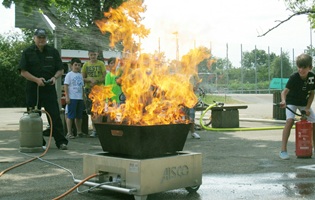 Zwischendurch zeigt Steffen Ochs Experimente, wo es auch mal knallt und raucht und berichtet über die verschiedenen Brandklassen und physikalische Grundlagen zum Thema Feuer. Nachmittags geht es dann zur Praxis. Rund um das Tanklöschfahrzeug gibt es praktische Übungen und mit unserem „Feuertrainer“ gibt es auch Löschversuche.